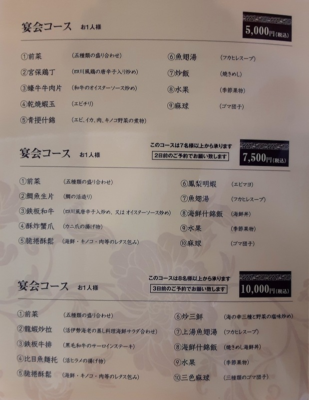 そして、宴会コースです。3種類あります。お1人様5,000円コース、7,500円コース、10,000円コースです。
